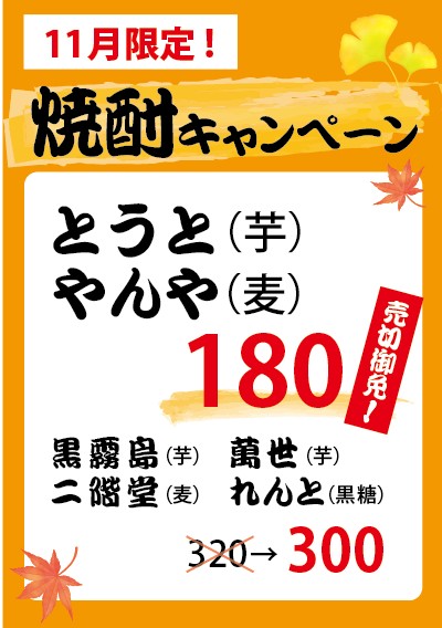 ・黒霧島(芋)・萬世(芋)・二階堂(麦)・れんと(黒糖)