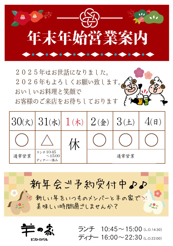 2025年も羊の家 あべの店をご愛顧くださり誠にありがとうございました。