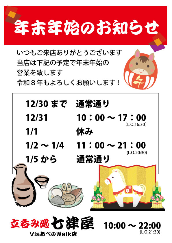 それでは令和8年も立呑み処七津屋をよろしくお願いいたします。