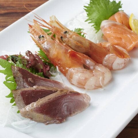 お刺身は、鰤とトロサーモンに赤海老を加えた3種でございます。